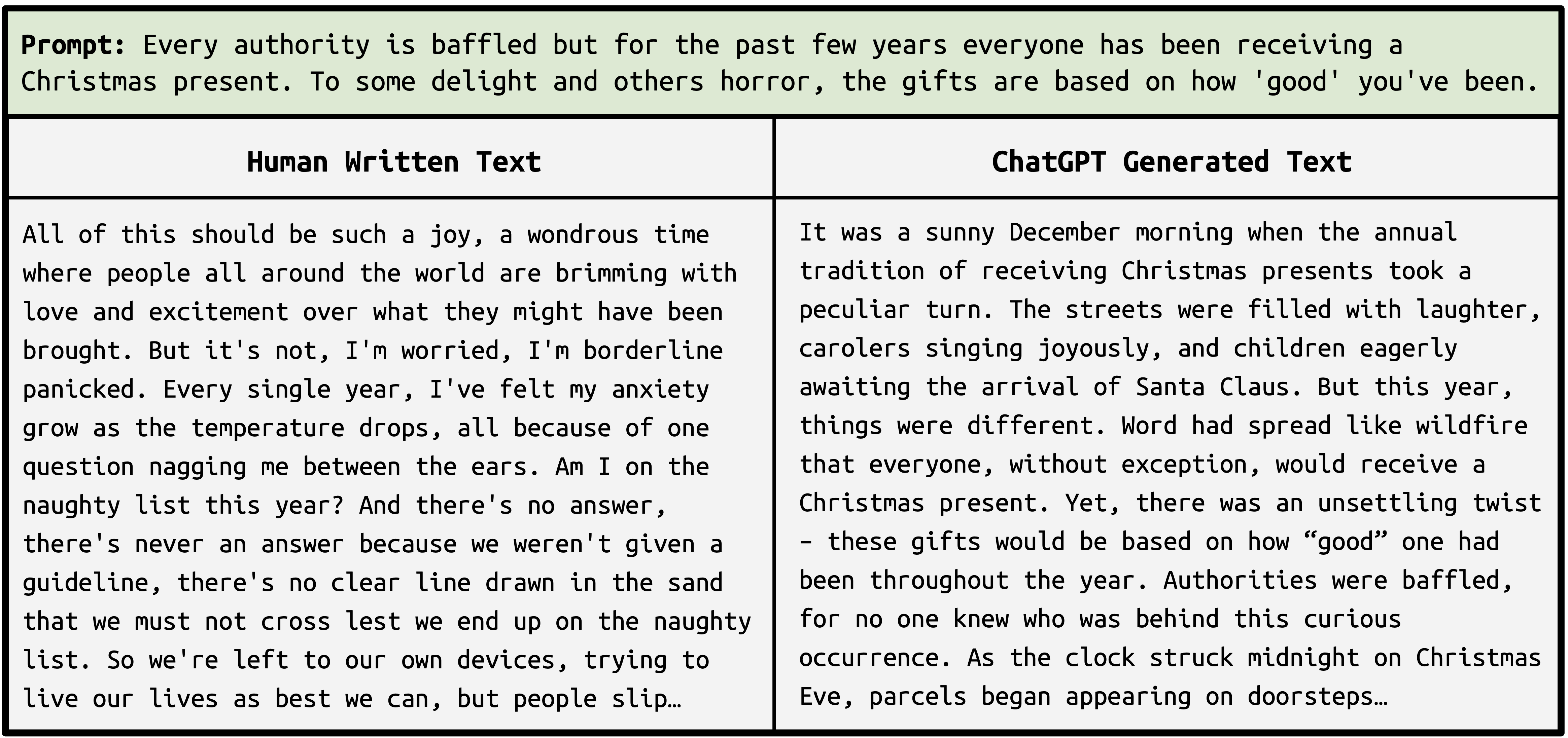 Examples of human-authored and AI-generated text from our datasets.