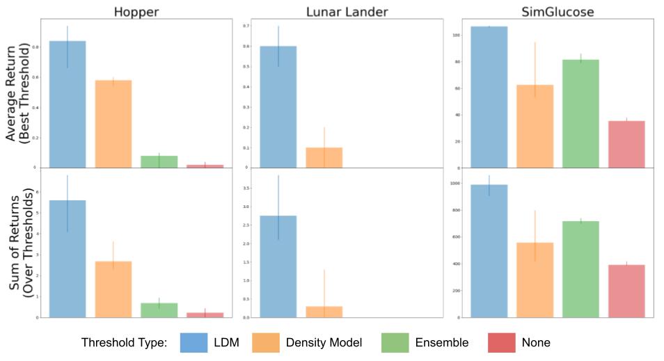 Evaluation of our method (LDM) compared to constraining a learning-based controller with a density model, the variance over an ensemble of models, and no constraint at all on several domains including hopper, lunar lander, and glucose control.