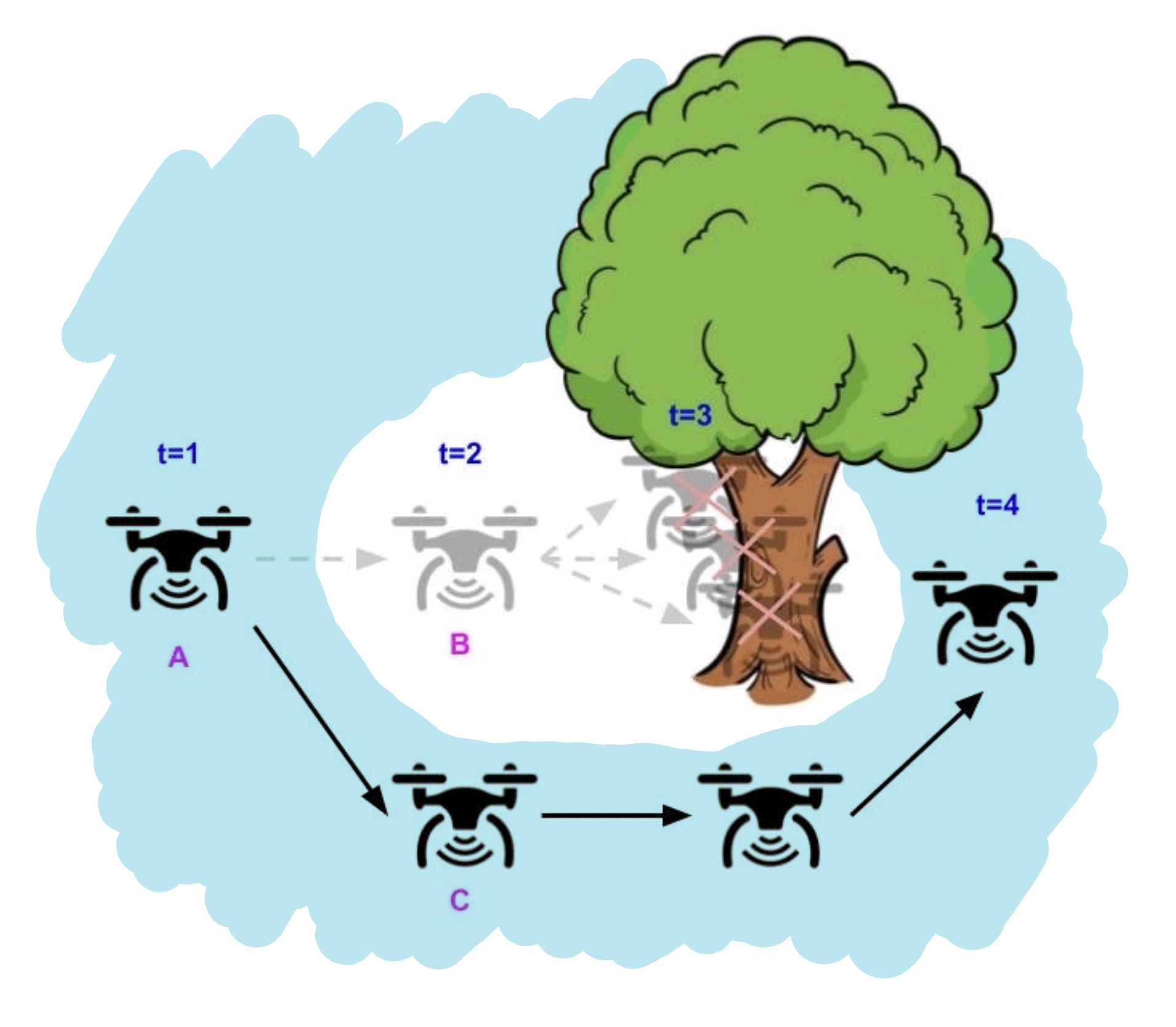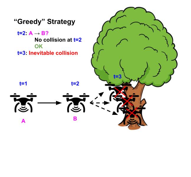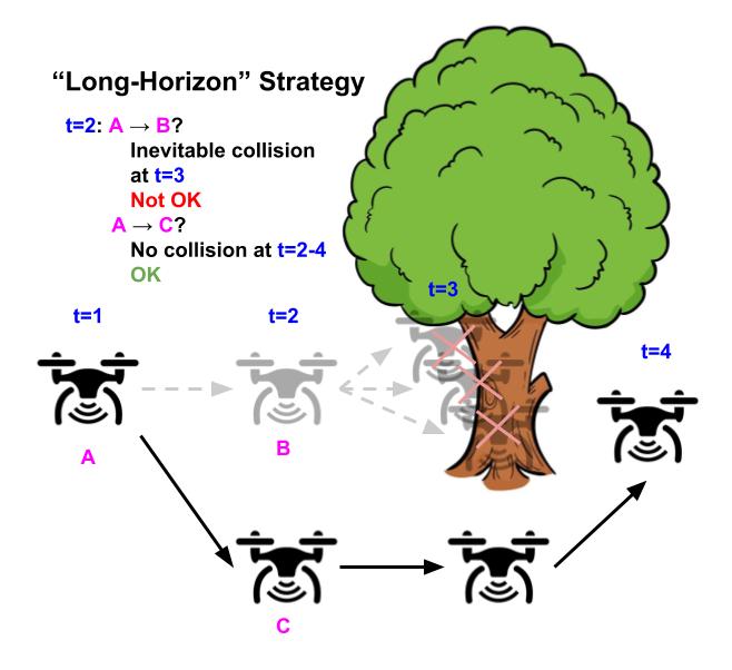 Illustrative example of a drone whose goal is to fly as straight as possible while avoiding obstacles. Using the “greedy” strategy of avoiding safety violations (left), the drone flies straight because there’s no obstacle in the next timestep, but inevitably crashes in the future because it can’t turn in time. In contrast, using the “long-horizon” strategy (right), the drone turns early and successfully avoids the tree, by considering the entire future horizon future of its trajectory.