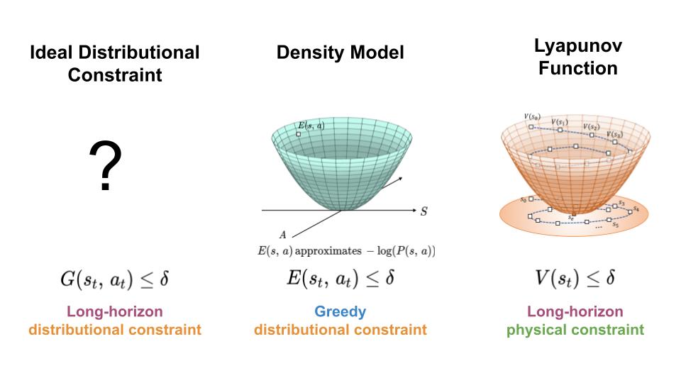 To regulate the distribution shift experience by learning-based controllers, we seek a mechanism for constraining the agent to regions of high data density throughout its trajectory (left). Here, we present an approach which achieves this goal by combining features of density models (middle) and Lyapunov functions (right).