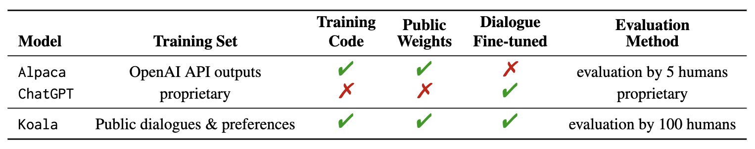 By encouraging researchers to engage with our system demo, we hope to uncover any unexpected features or deficiencies that will help us evaluate the models in the future. We ask researchers to report any alarming actions they observe in our web demo to help us comprehend and address any issues. As with any release, there are risks, and we will detail our reasoning for this public release later in this blog post. We emphasize that Koala is a research prototype, and while we hope that its release will provide a valuable community resource, it still has major shortcomings in terms of content, safety, and reliability, and should not be used outside of research. Below we provide an overview of the differences between Koala and notable existing models.