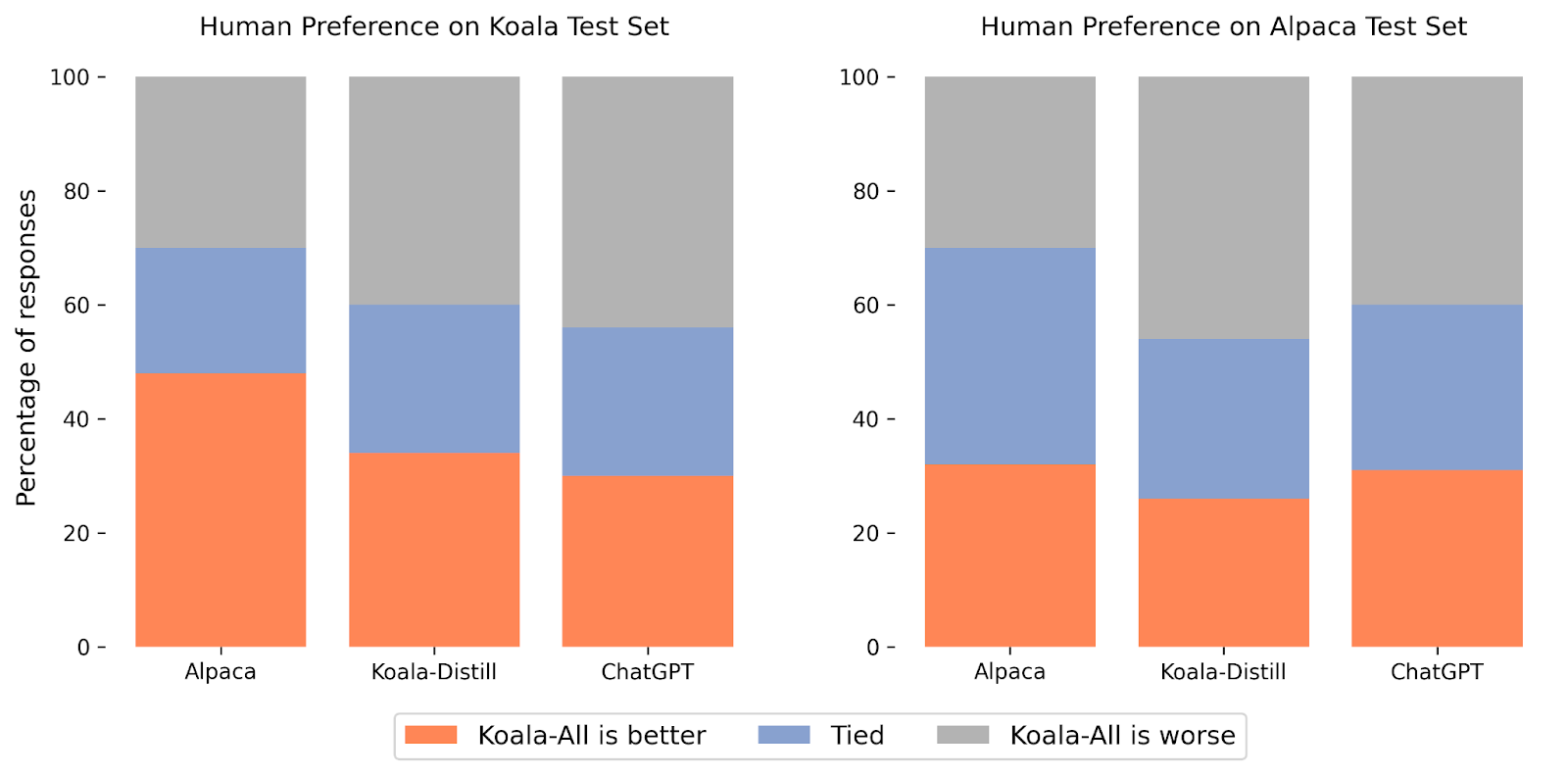 In our experiments, we evaluated two models: Koala-Distill, which solely employs distillation data, and Koala-All, which employs all of the data, including both distillation and open-source data. Our aim is to compare the performance of these models and evaluate the influence of distillation and open-source datasets on final performance. We ran a human evaluation to compare Koala-All with Koala-Distill, Alpaca, and ChatGPT. We present our results in the figure above. We evaluate on two different sets, one consisting of 180 test queries used by Stanford’s Alpaca (“Alpaca Test Set”), and our own test set (“Koala Test Set”).